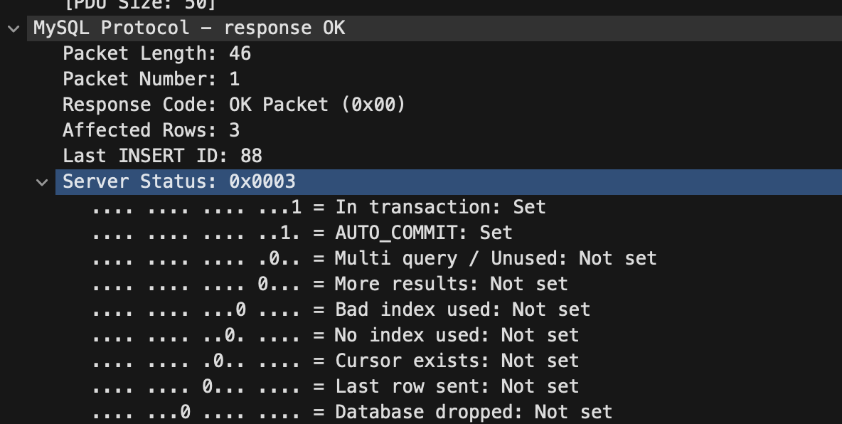 그리고 2번 패킷에서 OK packet 에 자세히 보면 아래와 같이 Last INSERT ID 라는 값이 내려온다.