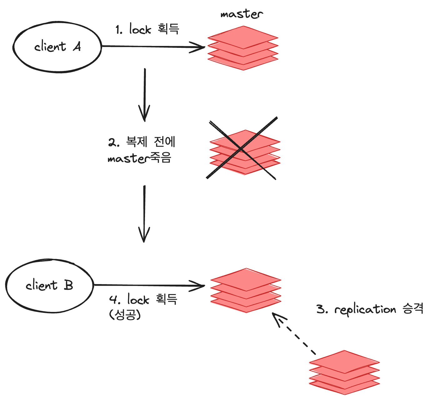 - client B 가 승격된 master 에게 락을 획득한다.