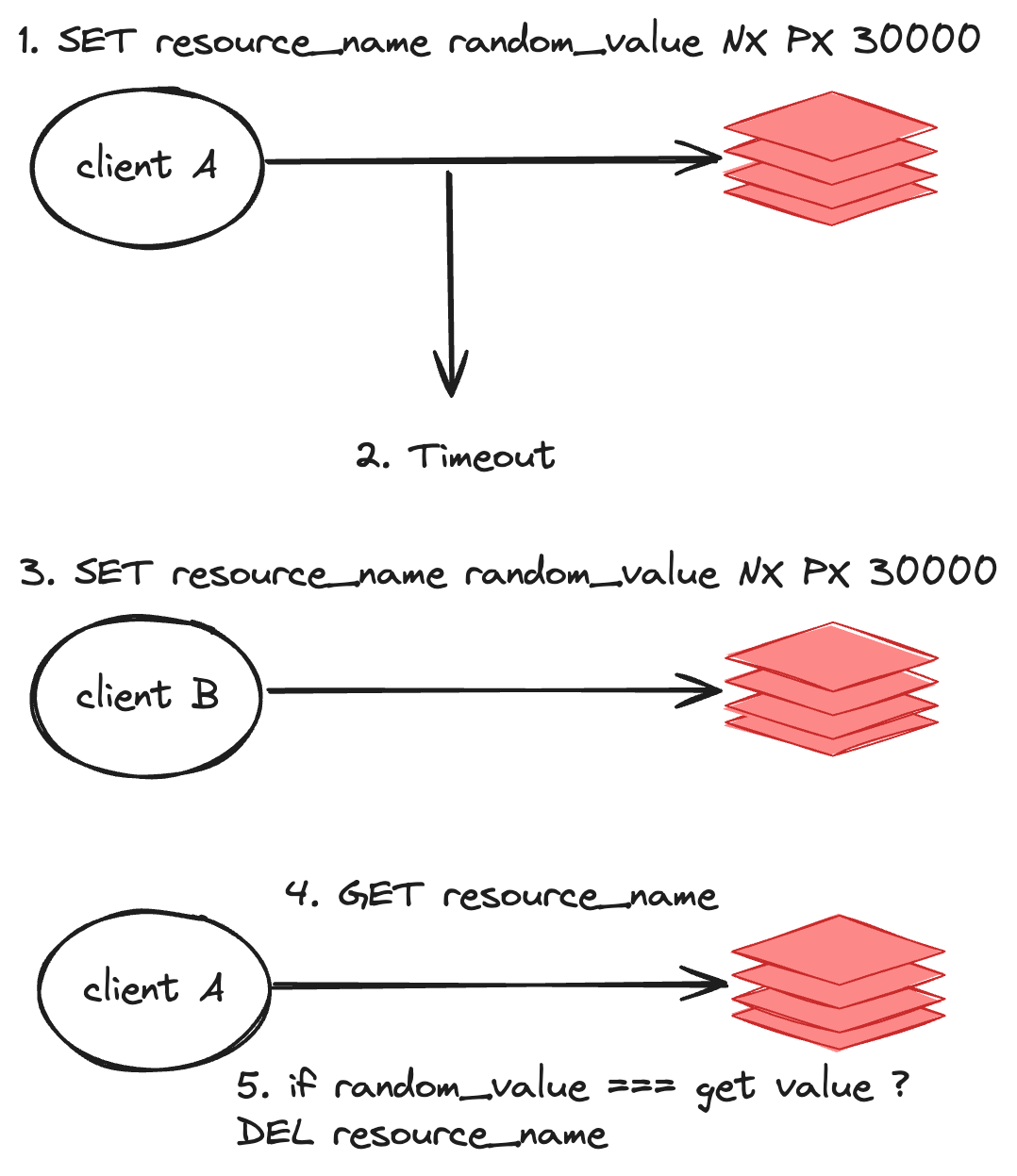 따라서, 아래와 같이 client A 가 생성시 넘겨준 random_value 가 lock key에 저장된 값과 같은지 확인해야한다. 일반적인 경우, random_value 는 timestamp 를 기준으로 설정하면 문제가 없으나 중복되는 경우에는