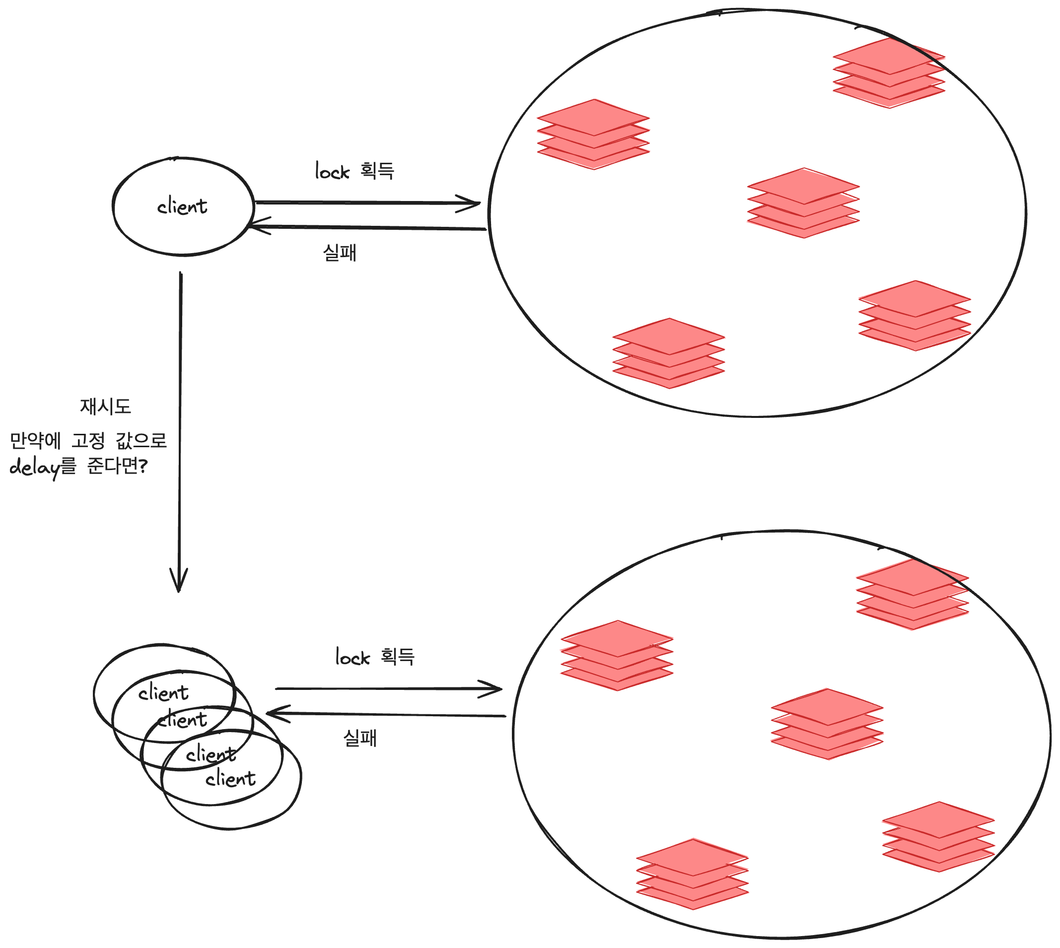 고정 값으로 delay 를 준다면, 동시에 같은 요청이 들어오는 경우 영원히 락 획득을 못할 가능성이 생긴다.