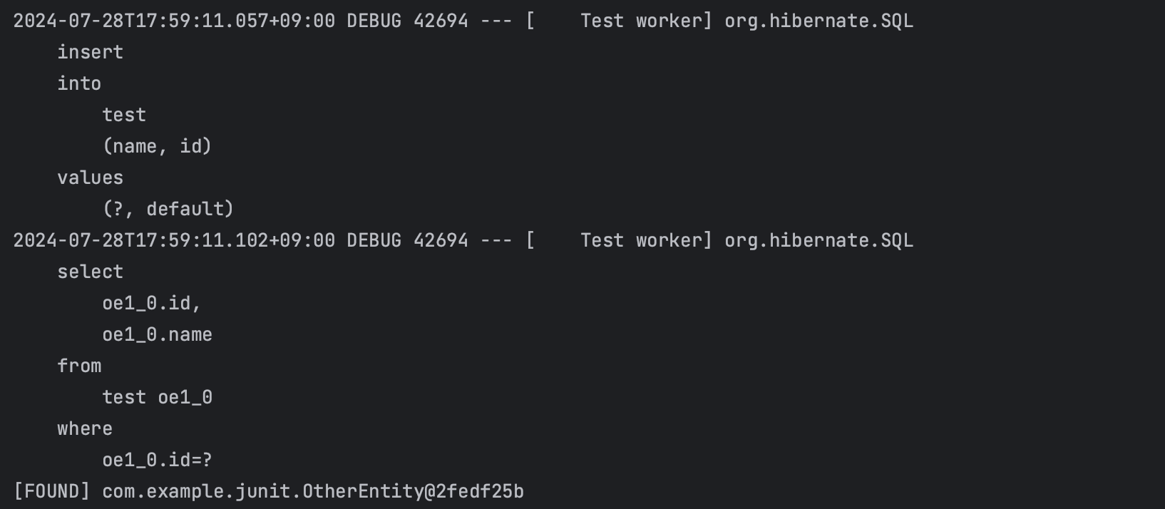 그리고 transaction이 아직 열려있기 때문에, 영속성 컨텍스트가 남아있어서 조회시점에도 영속성 컨텍스트를 통해 조회가 가능하다. 따라서, 실제 database에 조회하지 않는다.
