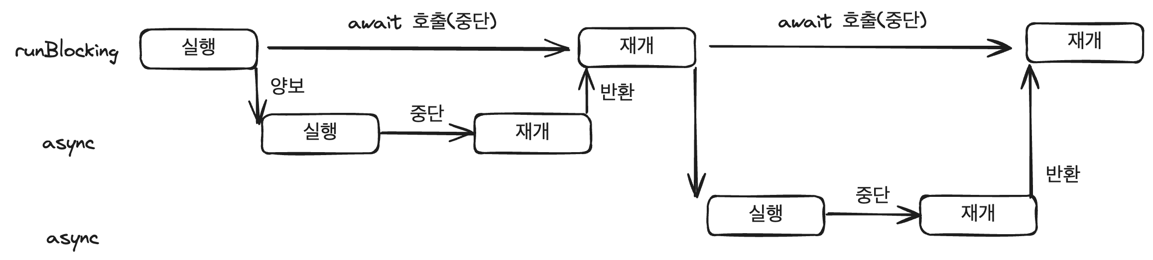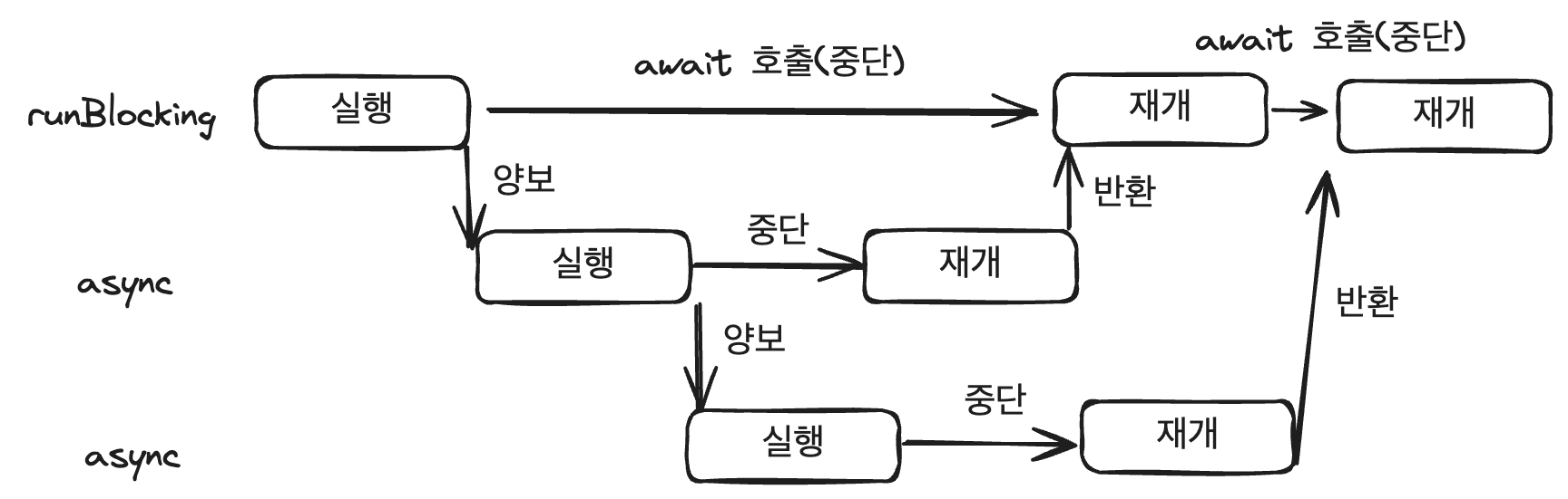 위 그림처럼, await 을 호출하는 순간 코루틴이 중단된다.