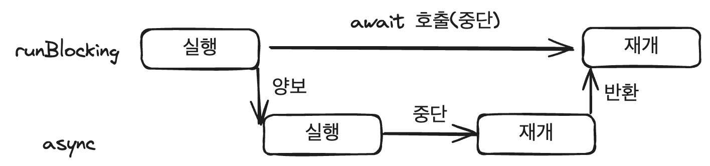 위 코드처럼 수정을하게 되면, runBlocking 이 await 로 중단되는 시점에