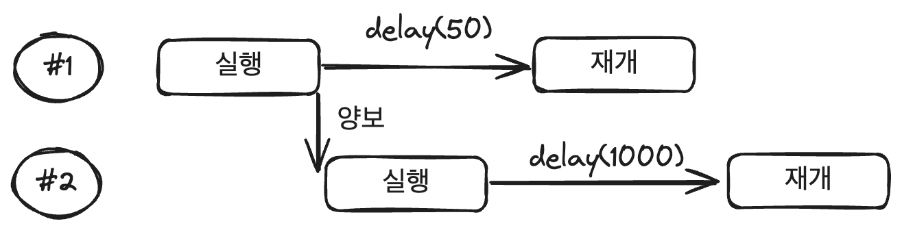 5번에서 delay(1000) 실행시, launch2 가 중단되었다. 하지만, 바깥의 launch1 은 delay(50) 이후에 실행이 재개되었다.
