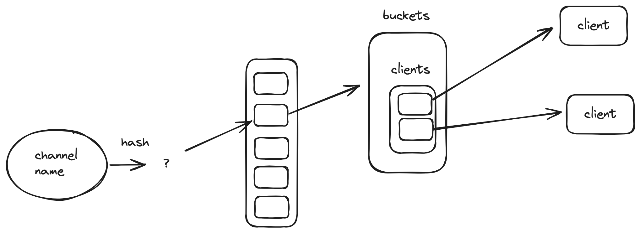 채널이름의 해싱 값을 인덱스로 배열의 인덱스를 찾고 해당 배열에 연결된 client 들을 찾는다.